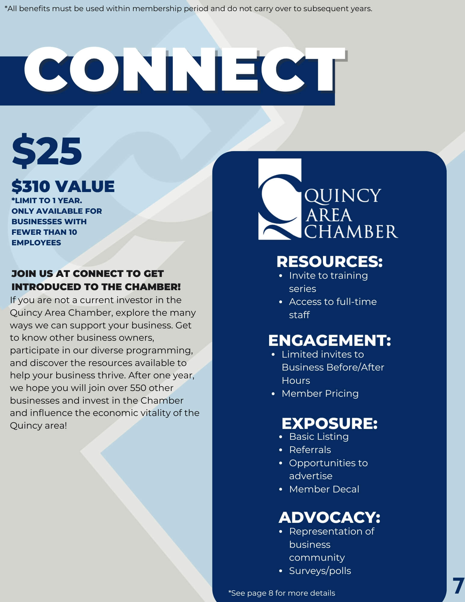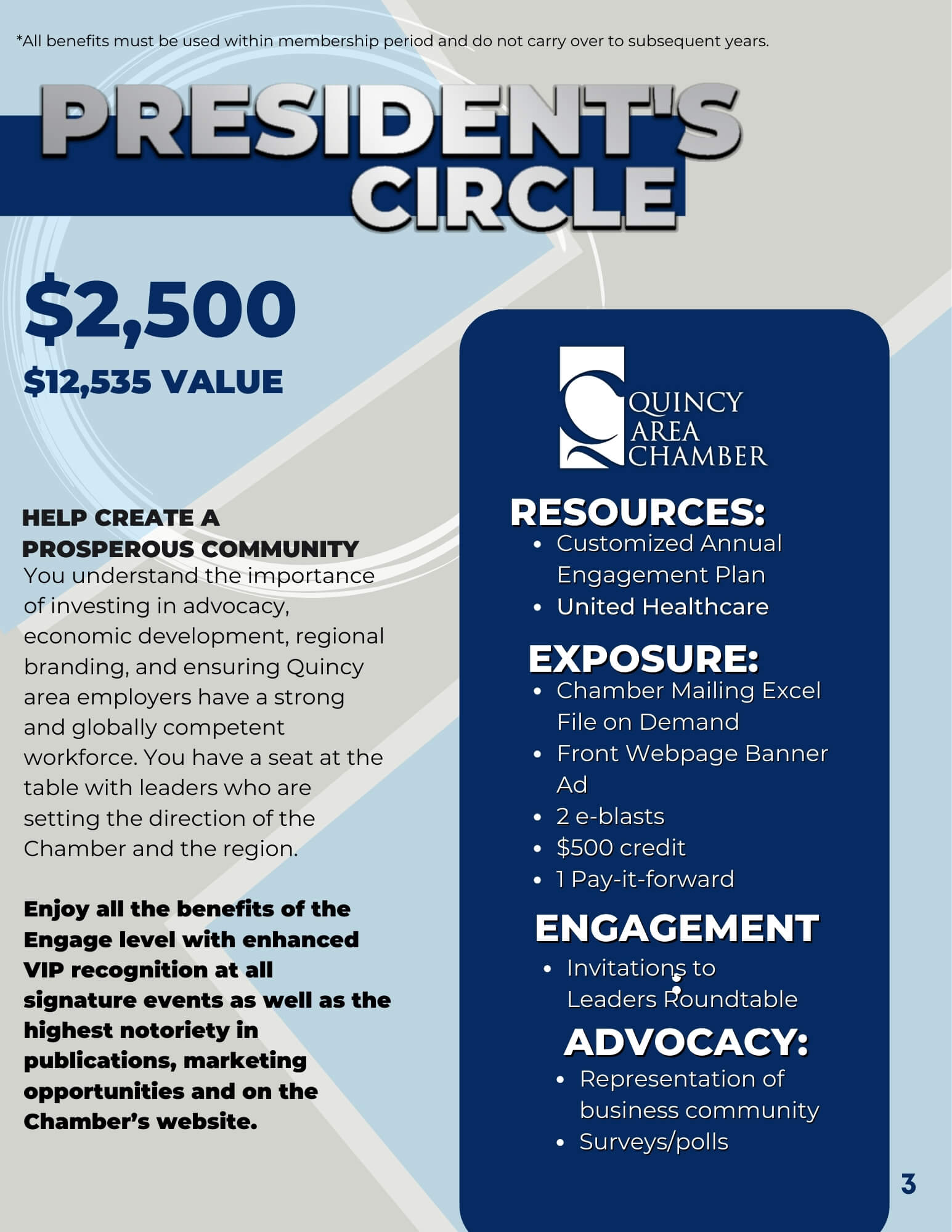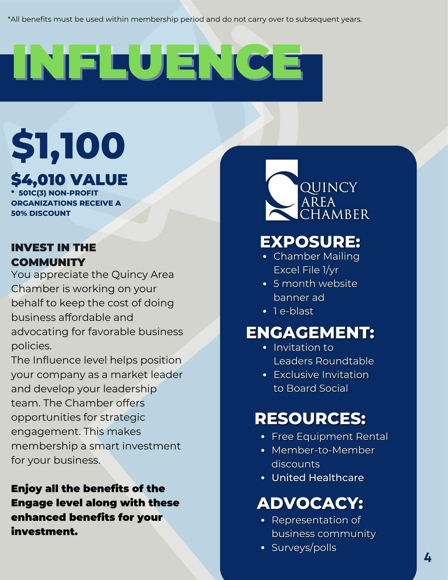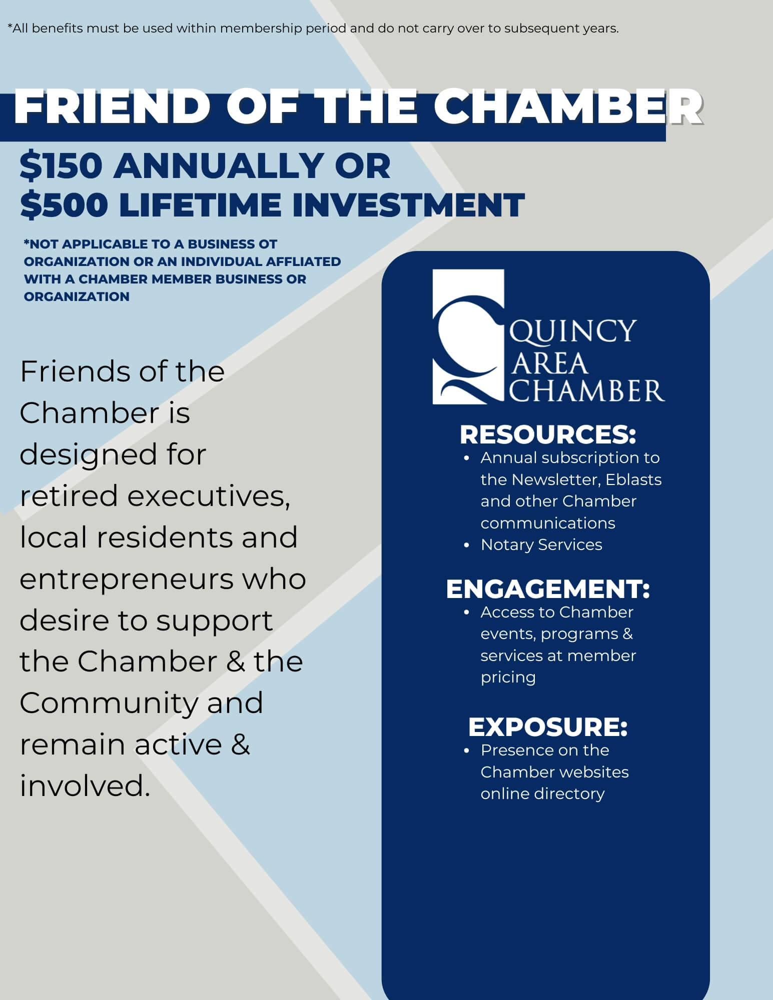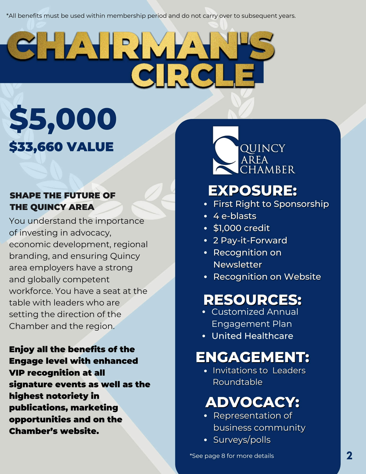 You understand the importance of investing in advocacy, economic development, regional branding, and ensuring Quincy area employers have a strong and globally competent workforce. You have a seat at the table with leaders who are setting the direction of the Chamber and the region.