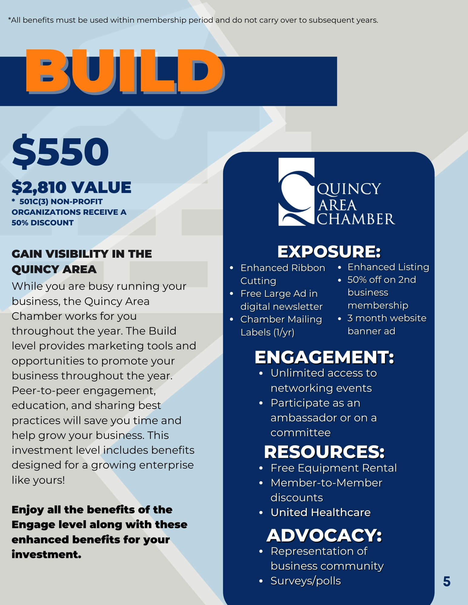 While you are busy running your business, the Quincy Area Chamber works for you throughout the year. The Build level provides marketing tools and opportunities to promote your business throughout the year. Peer-to-peer engagement, education, and sharing best practices will save you time and help grow your business. This investment level includes benefits designed for a growing enterprise like yours!