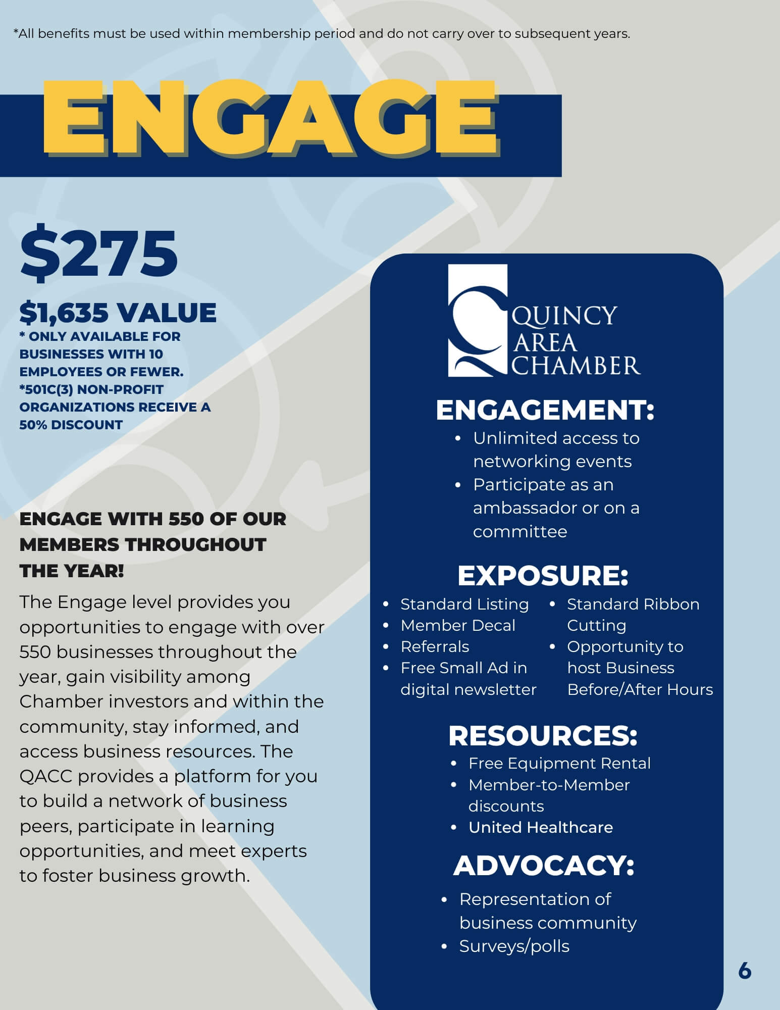 The Engage level provides you opportunities to engage with over 550 businesses throughout the year, gain visibility among Chamber investors and within the community, stay informed, and access business resources. The QACC provides a platform for you to build a network of business peers, participate in learning opportunities, and meet experts to foster business growth